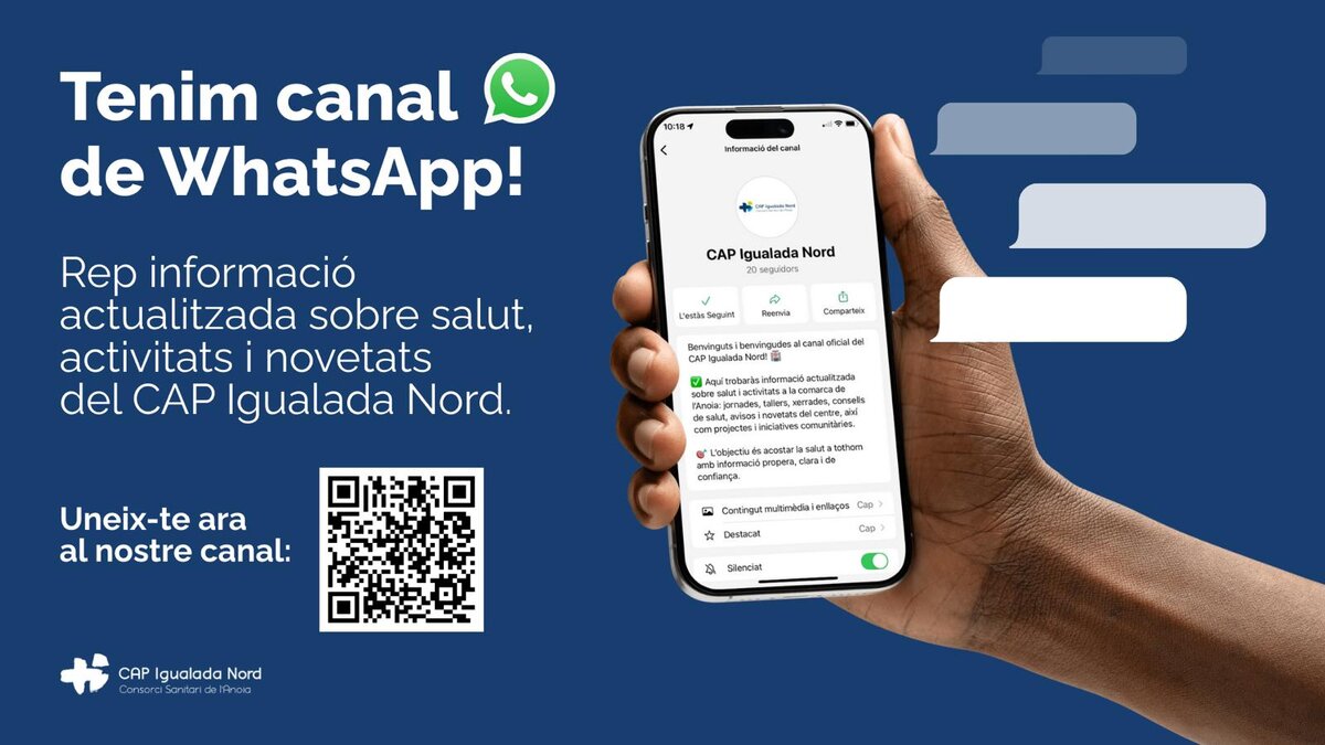 El CAP Igualada Nord del Consorci Sanitari de l'Anoia ha posat en marxa un nou canal de difusió a través de WhatsApp amb l'objectiu de facilitar informació actualitzada sobre les activitats, tallers, grups i recursos comunitaris que es duen a terme des del centre. Aquesta iniciativa vol reforçar la promoció de la salut i el benestar de la comunitat, tot millorant l'accessibilitat a les propostes obertes a la ciutadania.