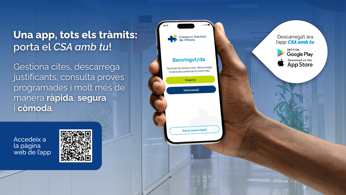 L'Hospital Universitari d'Igualada - Consorci Sanitari de l'Anoia (CSA) ha posat en marxa una nova aplicació mòbil adreçada a usuaris i pacients amb l'objectiu de fer més àgil i accessible la relació amb el centre. L'app facilita la gestió de cites, tràmits i l'accés a la informació dels usuaris, entre d'altres funcionalitats. Amb el nom "CSA amb tu", ja està disponible (en català i castellà) tant per a dispositius Android com iOS, i es pot descarregar a través de Google Play i App Store.