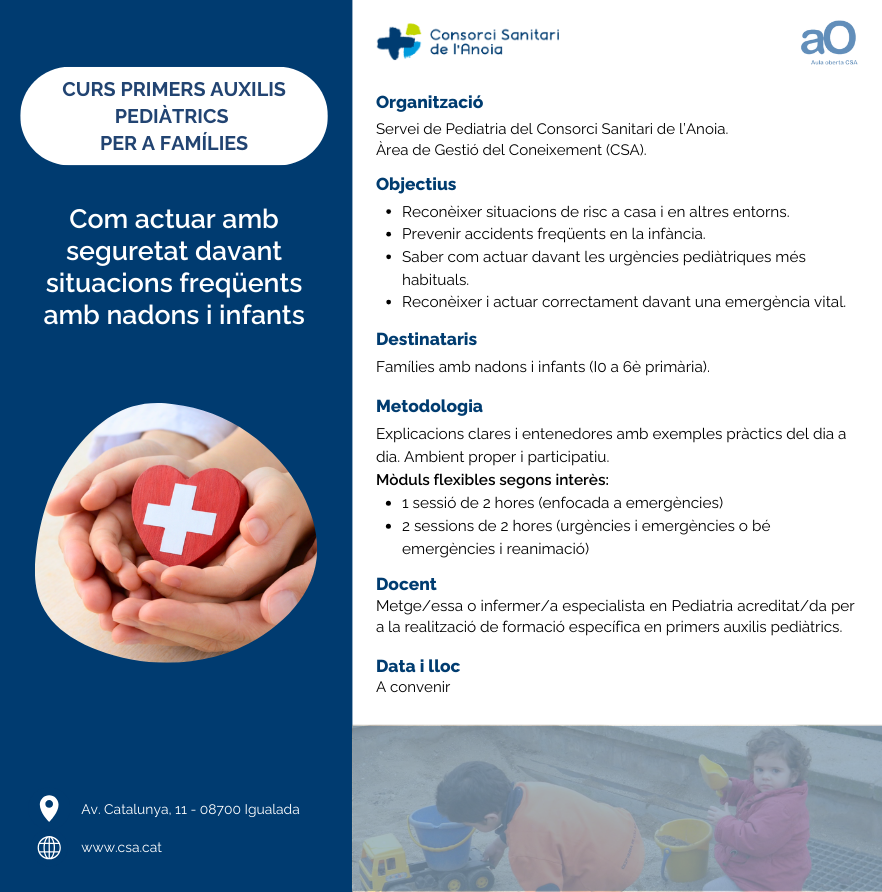 Proposta formativa en primers auxilis pediàtrics adreçada a famílies amb nadons i infants, que pot ser d'interès per a la vostra comunitat educativa i que es pot vehiculitzar a través de l'AFA com a activitat formativa per a mares, pares i cuidadors.