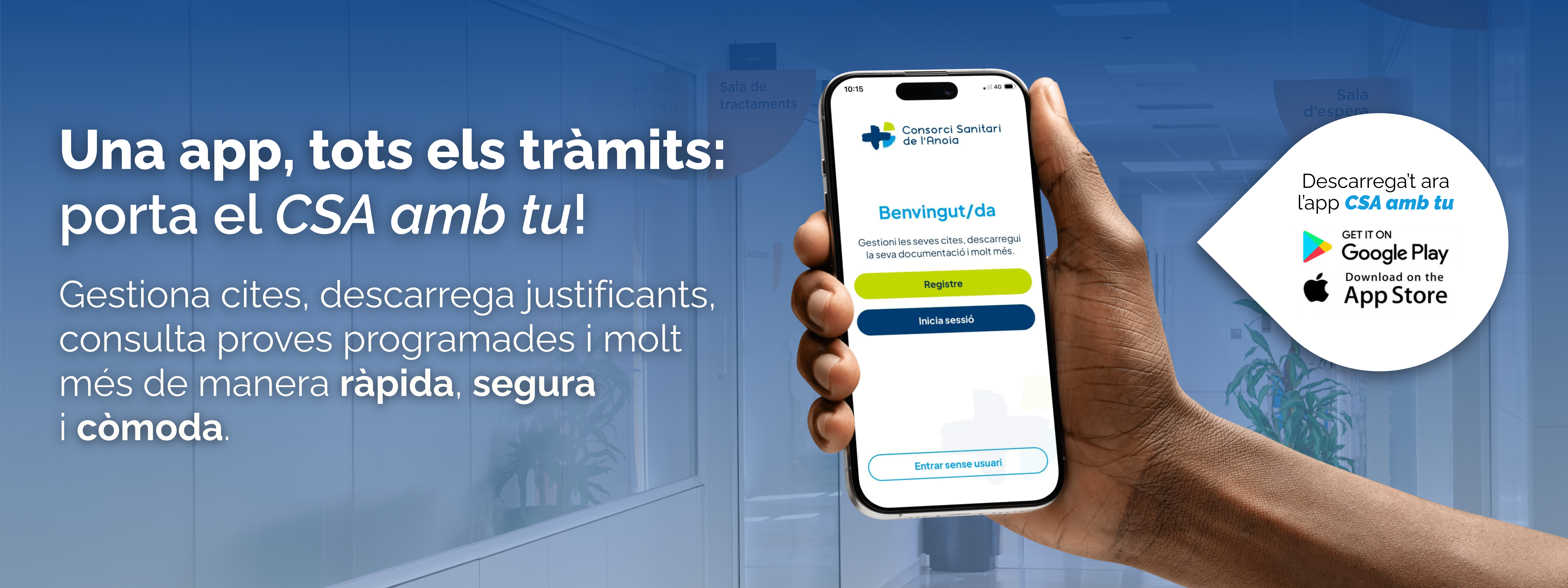 Ets usuari o usuària del Consorci Sanitari de l'Anoia? Amb l'aplicació CSA amb tu podràs gestionar tràmits i consultes relacionades amb l'Hospital Universitari d'Igualada des del teu dispositiu mòbil.