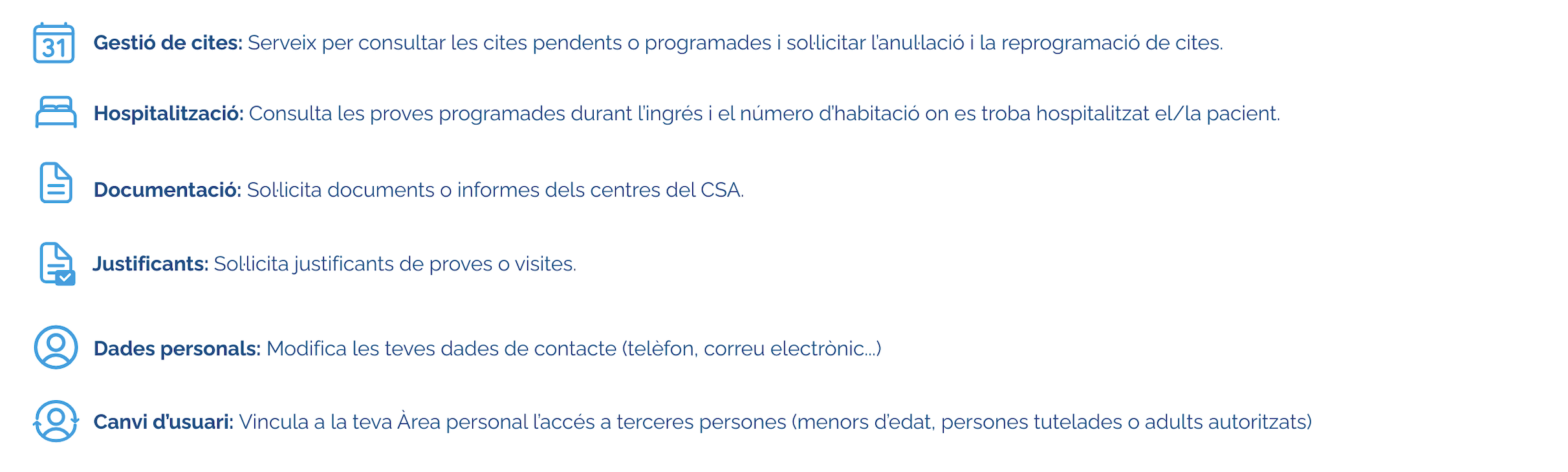 Es pot sol·licitar l'alta a l'àrea personal de manera online mitjançant un formulari o presencialment al taulell del Punt d’Informació de l'Hospital Universitari d’Igualada. L'usuari principal pot afegir al seu perfil altres persones al seu càrrec -pares, fills, parella, etc.- per gestionar de manera centralitzada la planificació de visites i proves, sempre amb prèvia autorització i acreditació de la seva potestat.